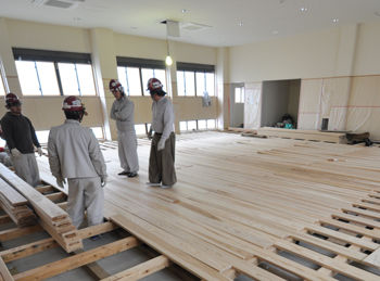 いよいよ剣道場床の工事は床貼りの段階まで来ました。